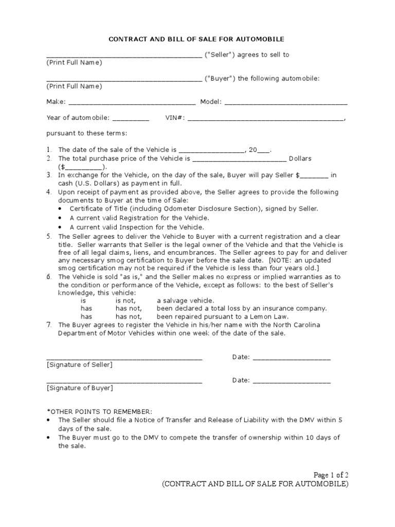 North Carolina Vehicle Bill Of Sale Template Google Docs Word Pdf Template Net
